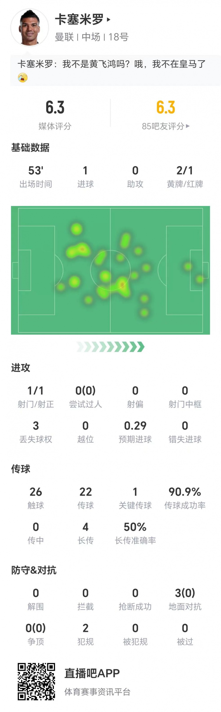 - 两黄变一红被罚下,卡塞米罗数据:1射1正进1球,1次关键传送球