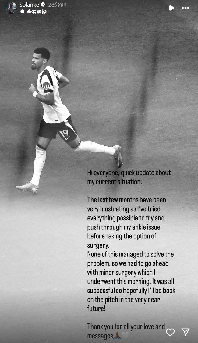 索兰克:今天接受了脚踝小手术,手术很成功希望很快回到运动活动 场
