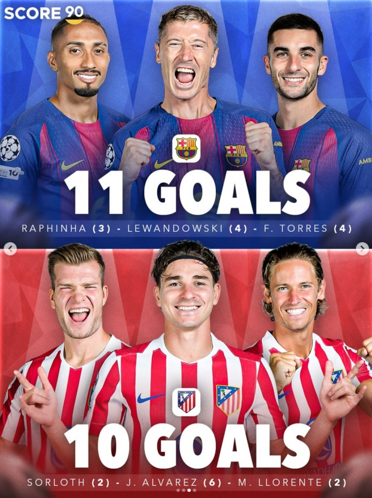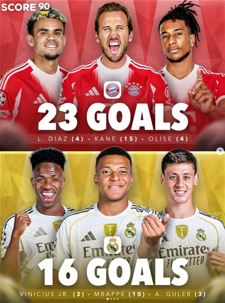 - 本赛季五大职业联赛 得分 最多三人组:拜仁3将23球居首,皇马16球次席2025-11-05