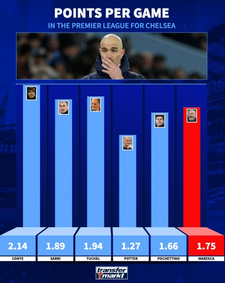 9月30日讯 切尔西近期战绩不佳,主帅马雷斯卡也受到不少质疑。德转盘点了切尔西近6位主帅在英超场均积分,苏超直播其中马雷斯卡1.75分位居第四,具体如下: